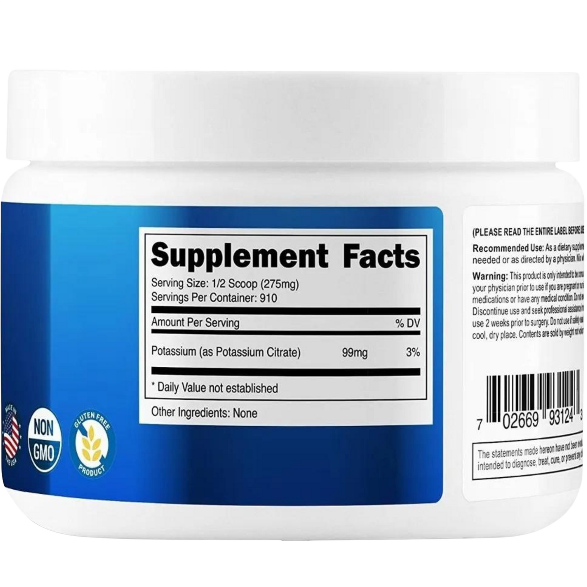 Nutricost ofrece potasio en polvo (por lo general como gluconato o citrato de potasio), con 99 mg por porción, lo que permite un ajuste flexible de la dosis.