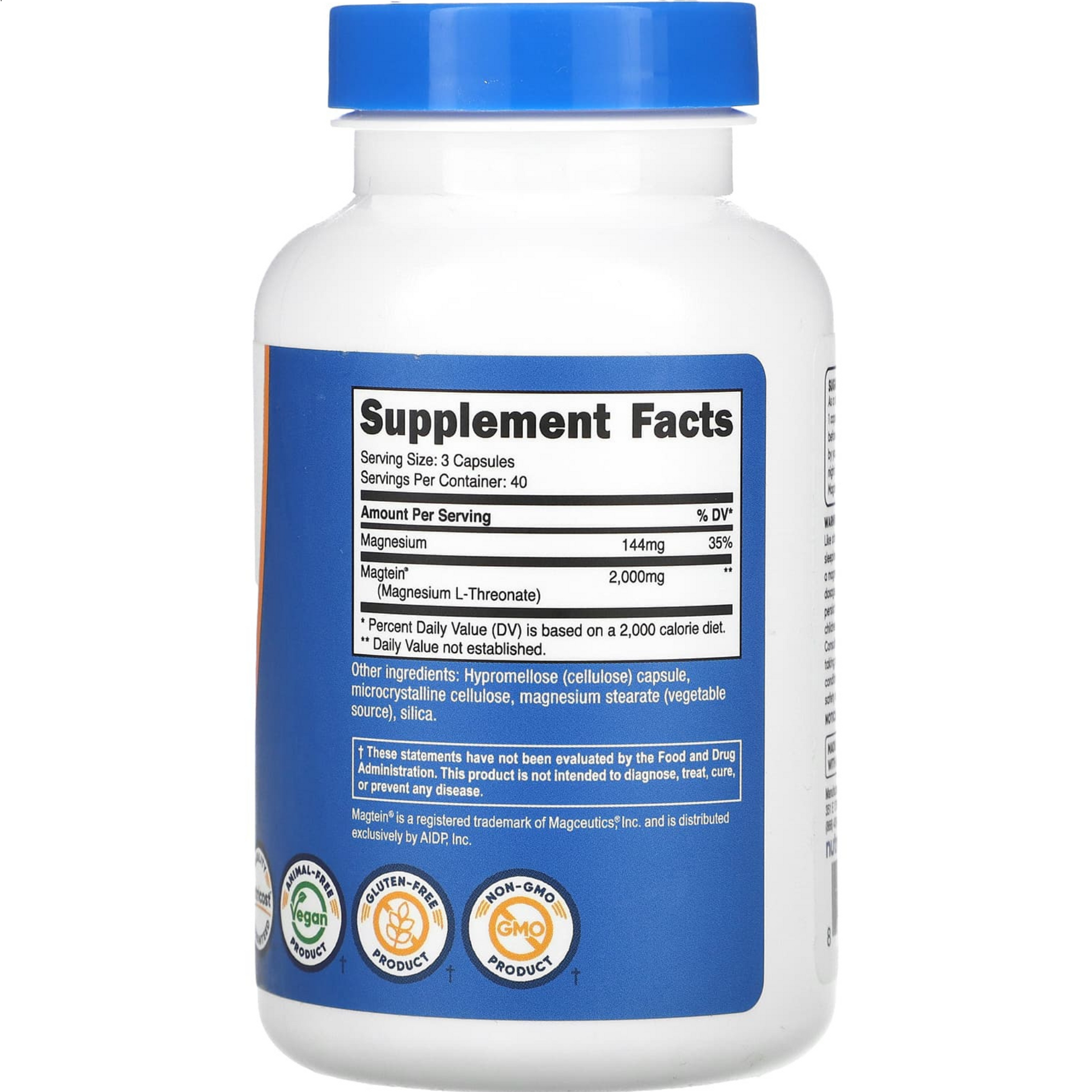 Cantidad por cápsula: 2000 mg de treonato de magnesio (Magtein®) = aprox. 144 mg de magnesio elemental .