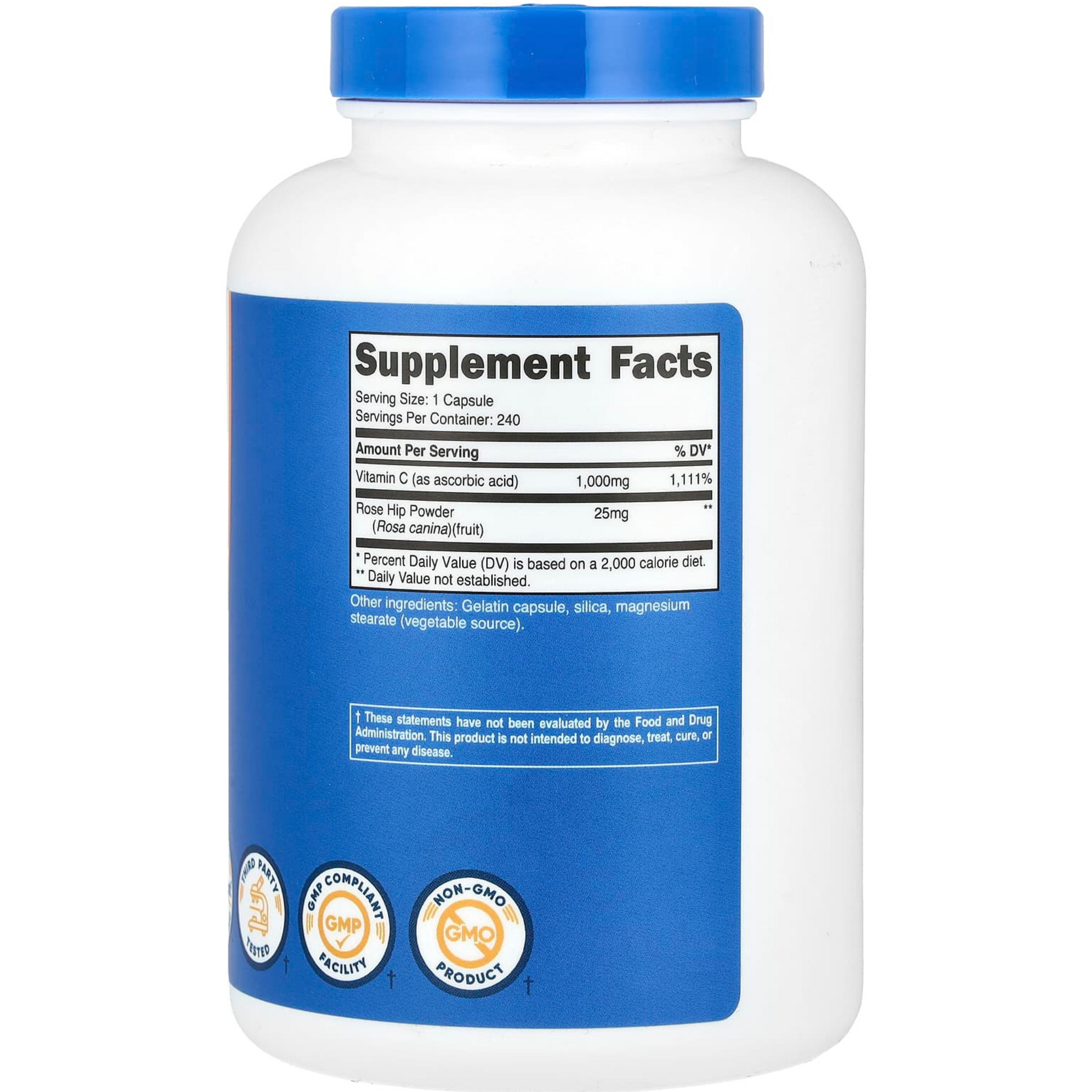Nutricost: Cada cápsula = 1000 mg Vitamina C + Rosa Mosqueta → normalmente 1 cápsula al día, con agua y junto a alimentos.